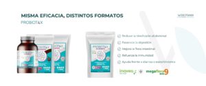Probiotax Microbiota combina probióticos (“Megaflora 9 Evo”) + prebióticos (fibra Inavea™), junto con L‑glutamina, zinc, extracto de melena de león y, con jengibre en el formato cápsulas.