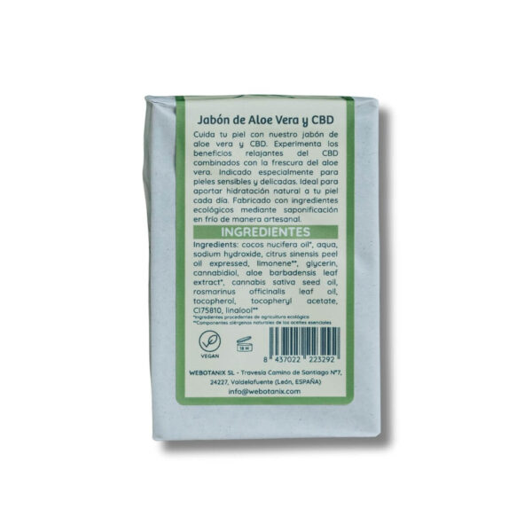 Jabón sólido artesanal de aloe vera y CBD de uso diario fabricado mediante saponificación en frío de manera artesanal con ingredientes ecológicos formulado para hidratar, calmar y aliviar picores y reducir imperfecciones. Ideal para pieles sensibles y delicadas.