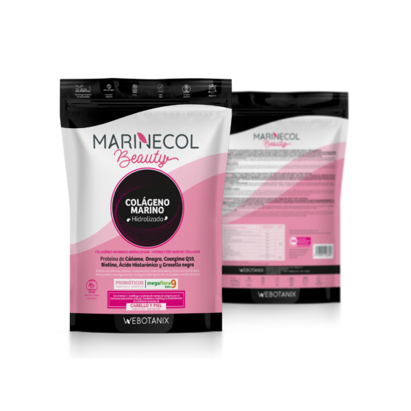 Marinecol Beauty (250g) es un complemento alimenticio a base de proteína de colágeno marino hidrolizado, extractos de plantas, ácido hialurónico, coenzima Q10, vitamina C, biotina y probióticos que aprovecha los beneficios del colágeno en piel, uñas y pelo.
