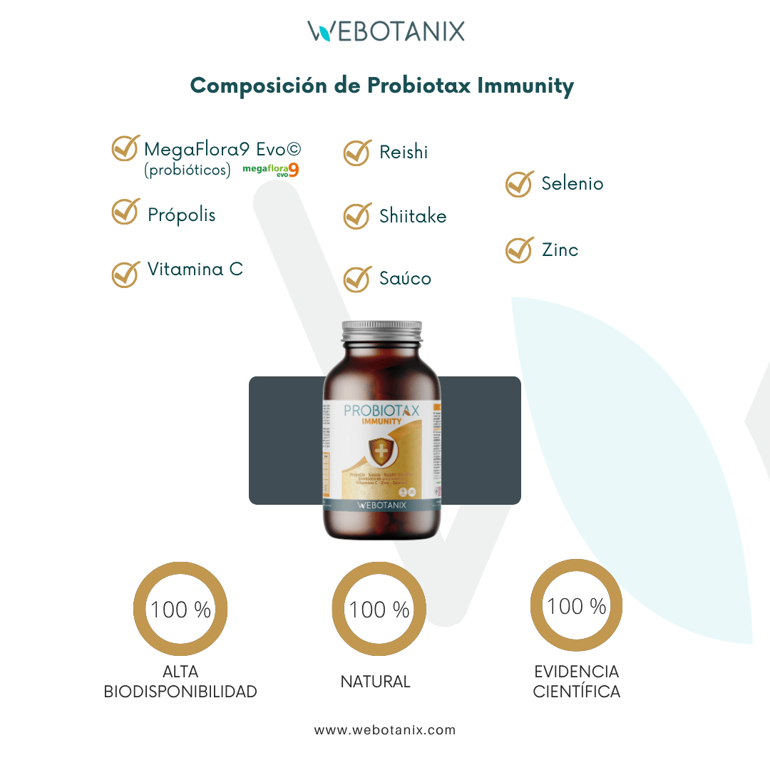Ingredientes: Extracto seco de propóleo (Propolis, resina), extracto seco de reishi (Ganoderma lucidum karst, cuerpo fructífero), extracto seco de saúco (Sumbucus nigra, fruto), extracto seco de shiitake (Lentinula edodes, fruto), Mezcla de fermentos lácticos (Megaflora® Evo: Lactobacillus acidophilus W22, L. plantarum W21/W1, L. paracasei W20, L. salivarius W24, Lactococcus lactis W19, Bifidobacterium lactis W51/W52, Enterococcus faecium W54), vitamina C (ácido-L-ascórbico), gluconato de zinc, levadura enriquecida en selenio, excipientes (almidón y maltodextrina de maíz, FOS, inulina, dextrina de maíz, cloruro de potasio, proteína vegetal hidrolizada, sulfato de magnesio, enzima amilasa, sulfato de manganeso). Cápsula vegetal: agente de recubrimiento (hidroxipropilmetilcelulosa).