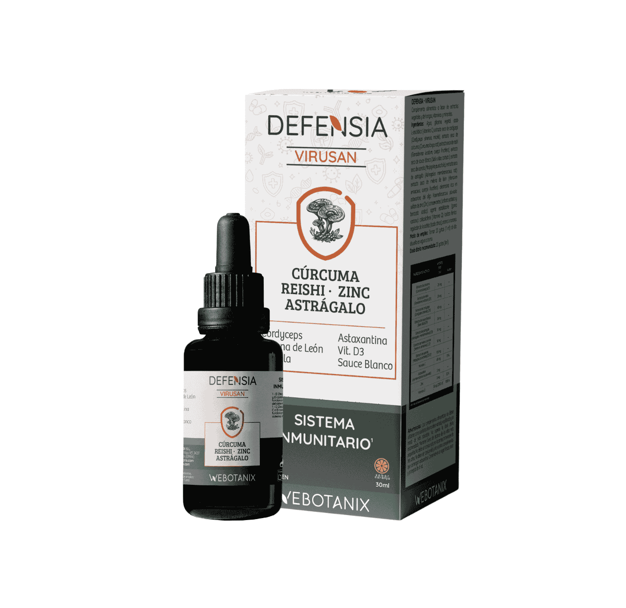 Agua; glicerina vegetal; ácido L-ascórbico (vitamina C); extracto seco de cordyceps (Cordyceps sinensis, micelio); extracto seco de cúrcuma (Curcuma longa, raíz); extracto seco de reishi (Ganoderma lucidum, cuerpo fructifero); extracto seco de sauce blanco (Salix alba, corteza ); extracto seco de acerola (Malpighia punicifolia); extracto seco de astrágalo (Astragalus membranaceus, raíz); extracto seco de melena de león (Hericium erinaceus, cuerpo fructífero); oleorresina rica en astaxantina del alga Haematococcus pluvialis; sulfato de zinc (Zinc); conservantes (sorbato potásico y benzoato sódico); agente estabilizante (goma xantana); colecalciferol (Vitamina D); fosfato férrico ; regulador de la acidez (ácido cítrico), aroma a naranja.